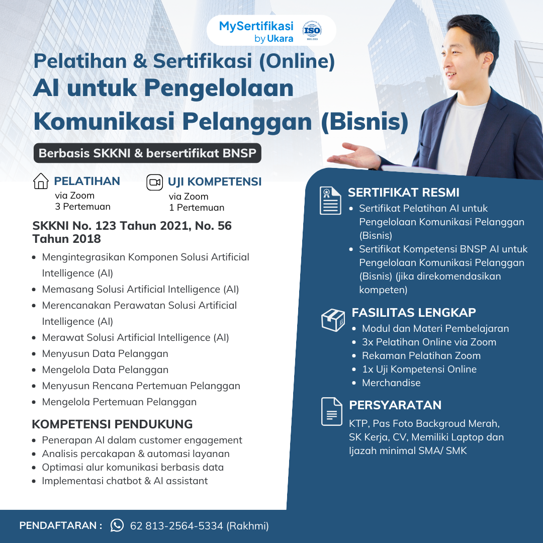 Pelatihan dan Sertifikasi AI untuk Pengelolaan Komunikasi Pelanggan (Bisnis) adalah program yang dirancang untuk membekali peserta dengan kompetensi dalam memanfaatkan teknologi Artificial Intelligence untuk meningkatkan efektivitas komunikasi dan layanan pelanggan. Peserta akan mempelajari penerapan AI dalam chatbot, analisis sentimen pelanggan, otomatisasi respon, pengelolaan data pelanggan, serta pemanfaatan insight berbasis AI untuk mendukung strategi bisnis dan peningkatan pengalaman pelanggan.