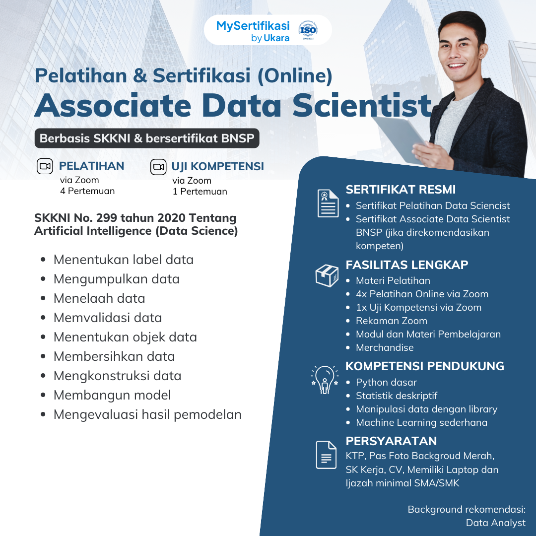 MySertifikasi by Ukara menyelenggarakan pelatihan dan uji kompetensi Associate Data Scientist secara online. Alur pelaksanaan mencakup: