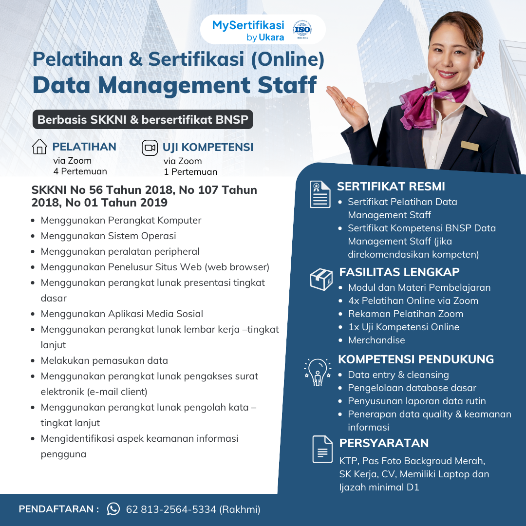 MySertifikasi by Ukara menyelenggarakan Pelatihan dan Sertifikasi BNSP Data Management Staff secara online dengan skema sebagai berikut: