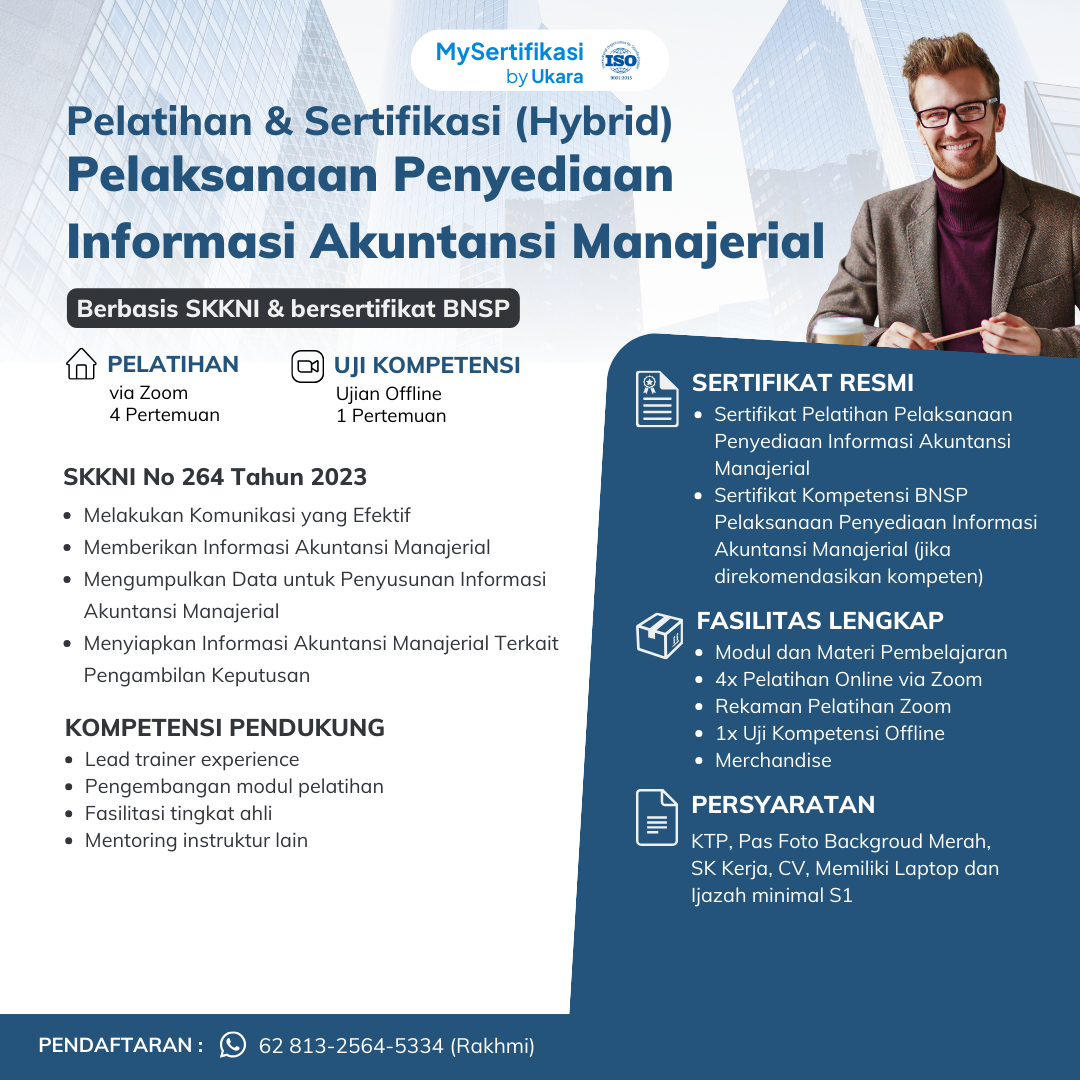MySertifikasi by Ukara menyelenggarakan Pelatihan & Sertifikasi BNSP Pelaksanaan Penyediaan Informasi Akuntansi Manajerial melalui skema blended learning. Program dilaksanakan selama 5 hari, dengan ketentuan: