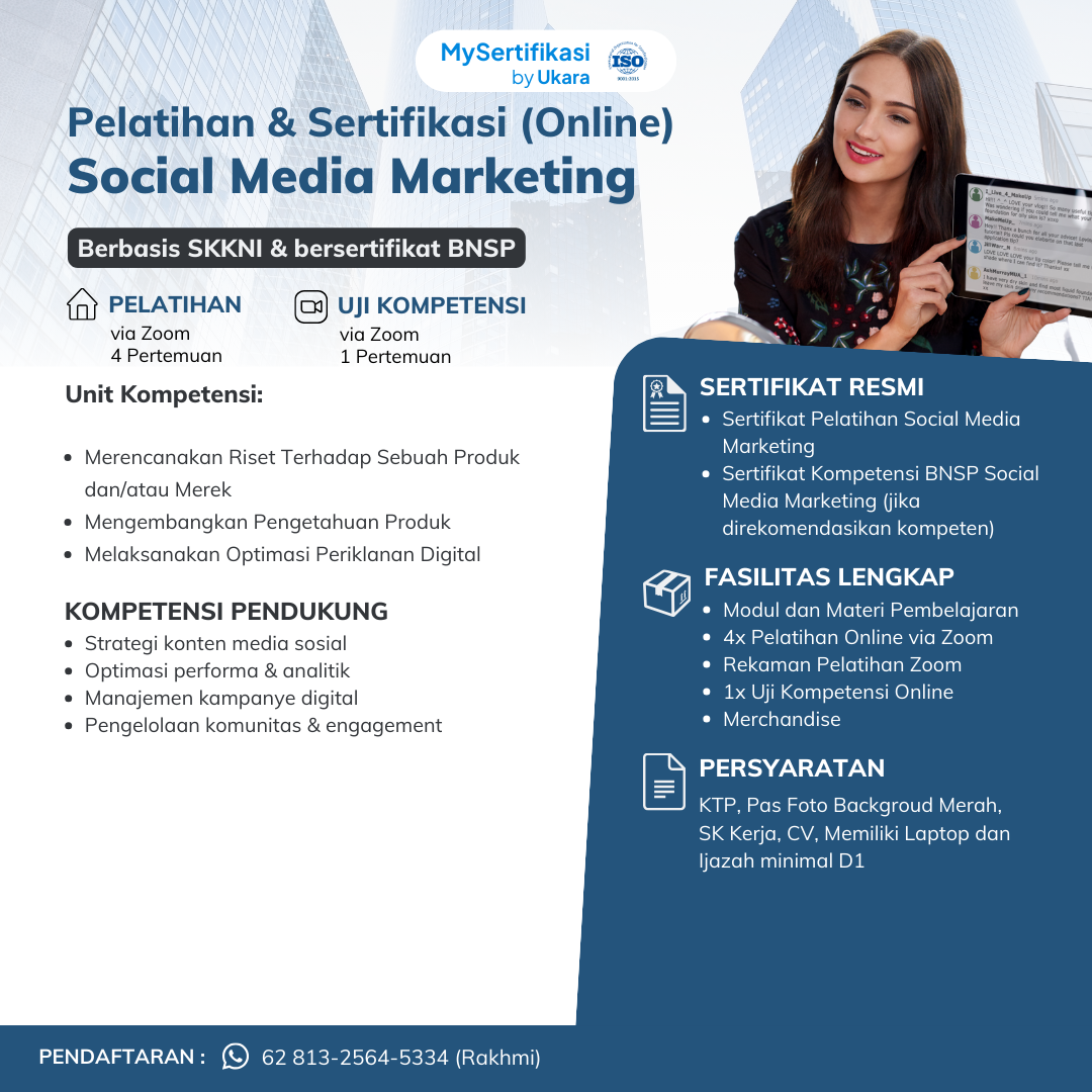 MySertifikasi by Ukara menyelenggarakan pelatihan dan ujian kompetensi Social Media Marketing secara online. Program berlangsung selama 5 hari: