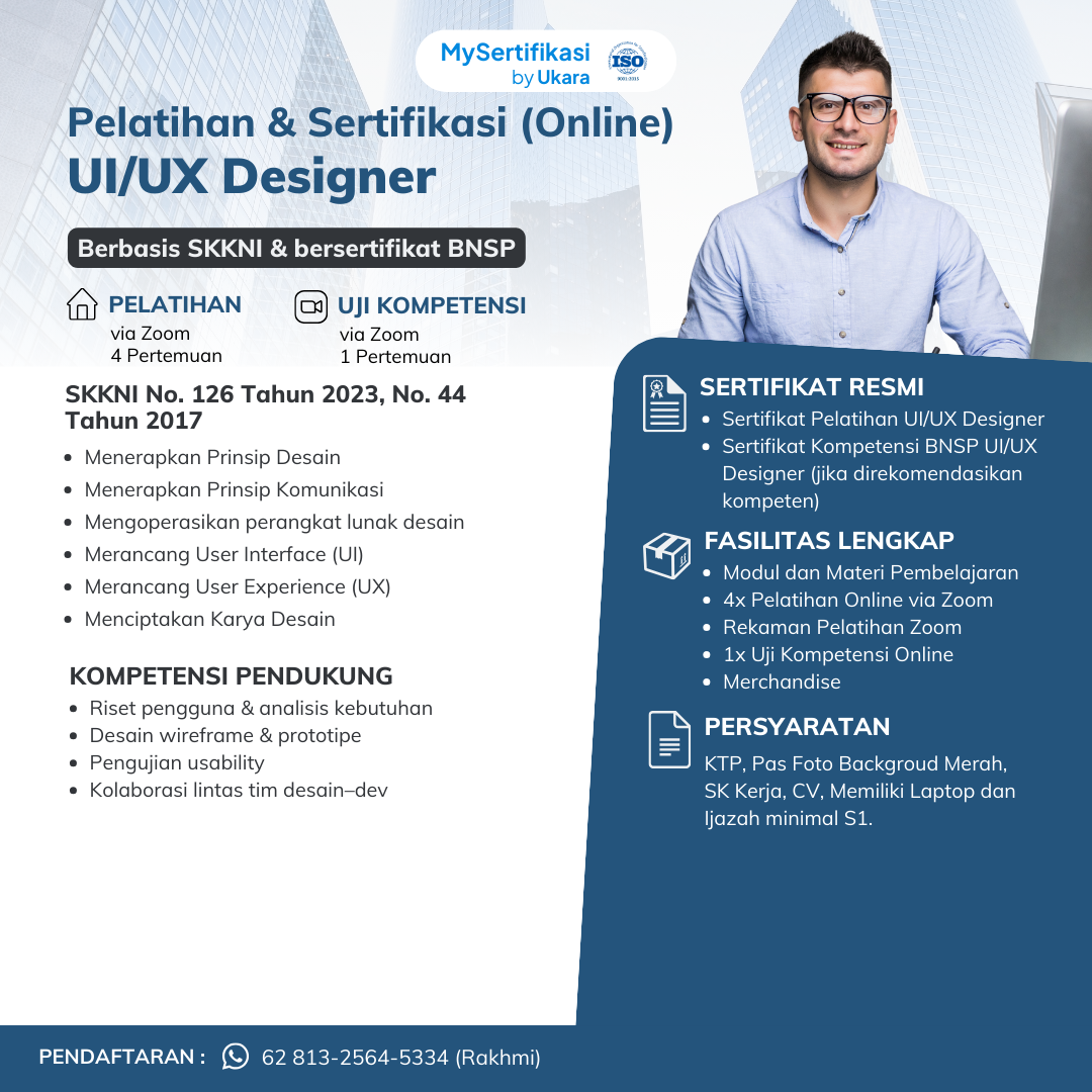 Pelatihan & Sertifikasi BNSP UI/UX Designer dirancang untuk membekali peserta dengan kompetensi profesional dalam merancang dan mengembangkan antarmuka serta pengalaman pengguna yang efektif. Program ini memberikan pemahaman menyeluruh terkait standar nasional SKKNI Desain Grafis dan Desain Komunikasi Visual Nomor 126 Tahun 2023 serta Software Development – Software Requirement Analysis and Design Nomor 44 Tahun 2017.
